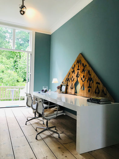 De werkkamer werd groen-blauw om te werken gecombineerd met hout en een enorm hoogglans wit bureau. Voor de woonkamer hadden we op reis een enorme antieke display kast gevonden. Ik houd van antiek gecombineerd met modern. Ik koos een koloniaal bomen behang van IKSEL met veel groene en wat blauwe tinten gecombineerd met grasgroen als contrast met het donkere mahony hout en om het antiek wat op te frissen. Met daarvoor een moderne design bank van B&B Italia.